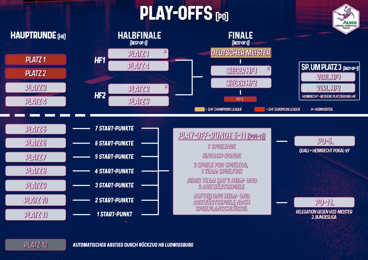 [Bearbeiten | Quelltext bearbeiten]In der Hauptrunde spielen die Mannschaften im Modus Jeder gegen Jeden mit je einem Heim- und Auswärtsspiel. In der Saison 2025/26 folgen auf die Hauptrunde die zweigeteilten Play-offs. Die Teams der Plätze 1–4 spielen im Best-of-three-Modus in Halbfinale und Finale die Meisterschaft aus. Im Halbfinale spielt Platz 1 gegen 4 und 2 gegen 3. Die höher platzierten Mannschaften haben Heimrecht im ersten und im möglichen dritten Spiel ihrer Serie. Der Sieger des ersten Halbfinals hat in der Finalserie Heimrecht. Der Sieger des Finales ist Deutscher Meister und erhält einen Startplatz in der EHF Champions League, der Finalverlierer einen in der EHF European League. Zudem sind die beiden Erstplatzierten der Hauptrunde für die European League qualifiziert. Die Halbfinalverlierer spielen ein Spiel um Platz 3.